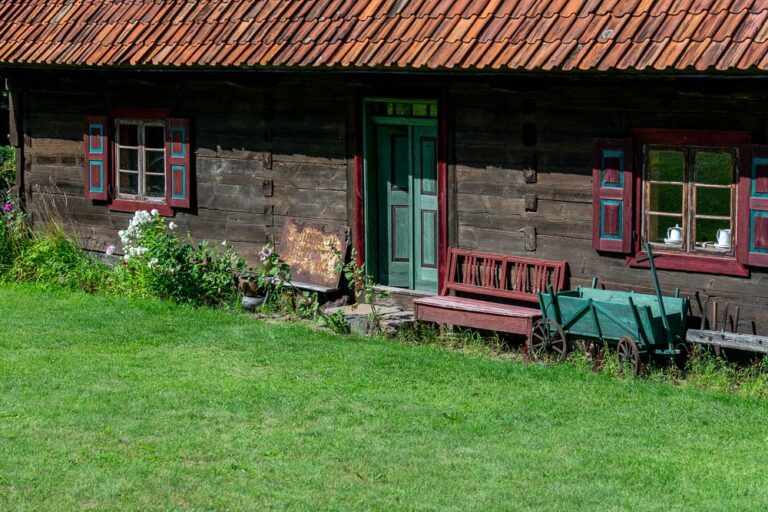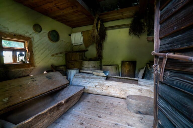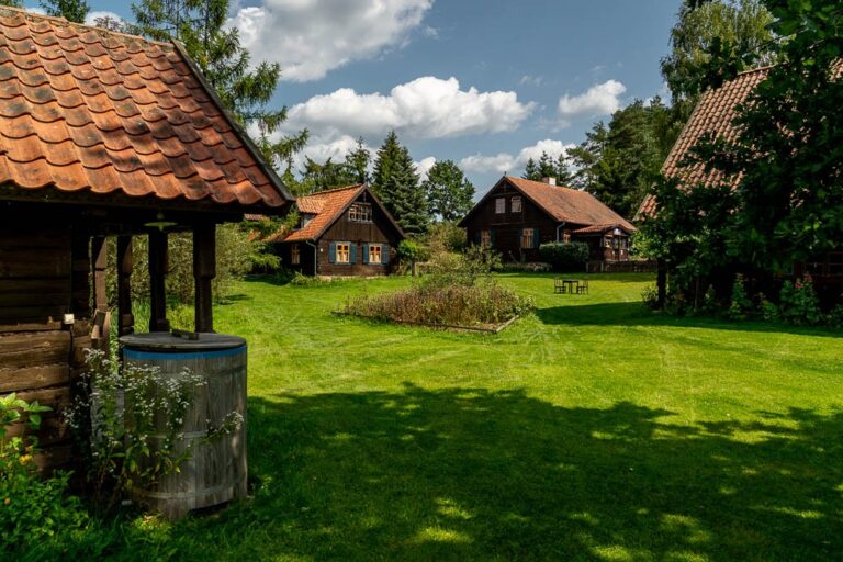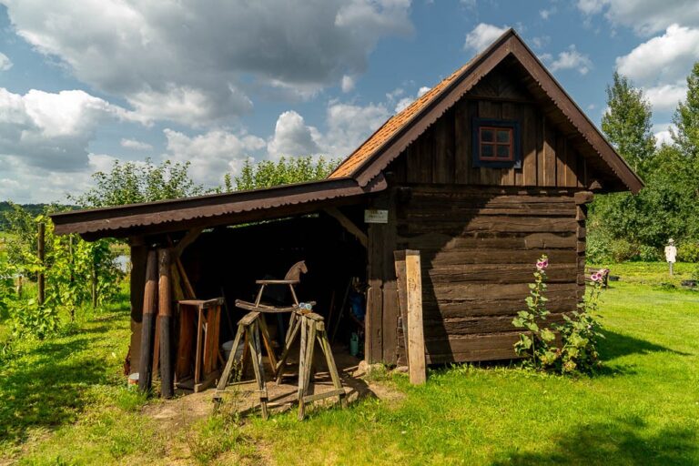 The settlement’s most valuable asset is the arcaded cottage made of massive logs, relocated from Warnowo. It is a true rarity – only two such 200-year-old buildings (with arcades on both gable ends) survive today!
