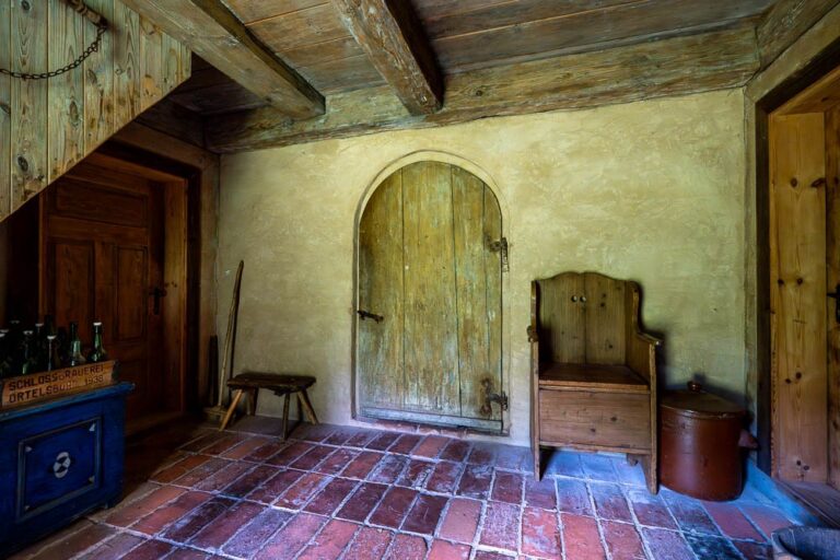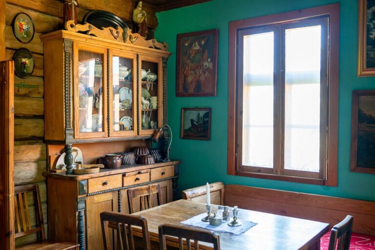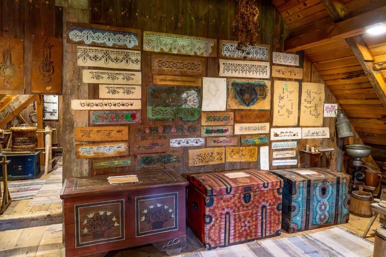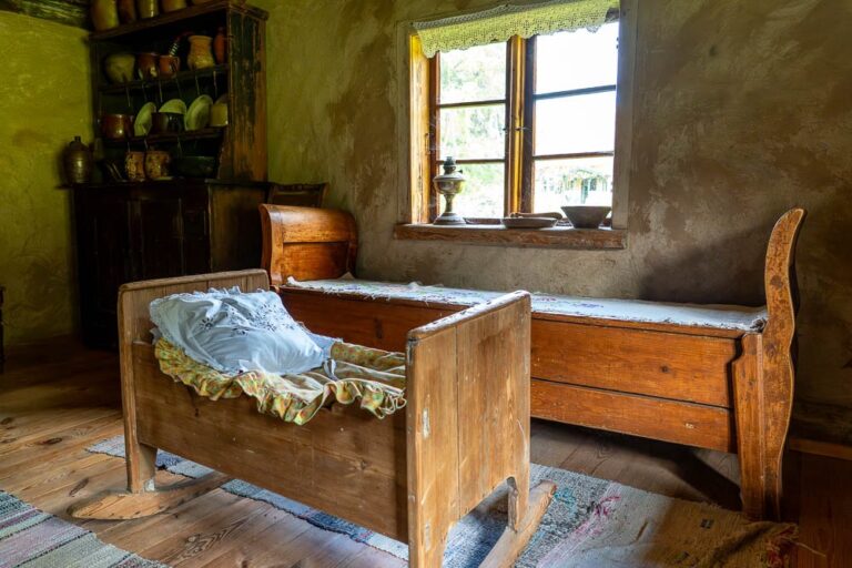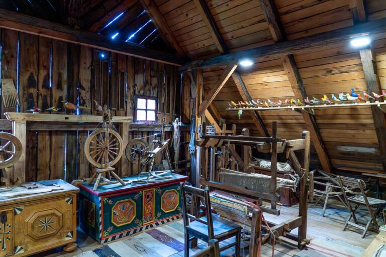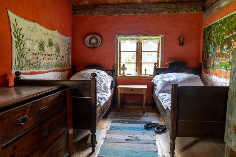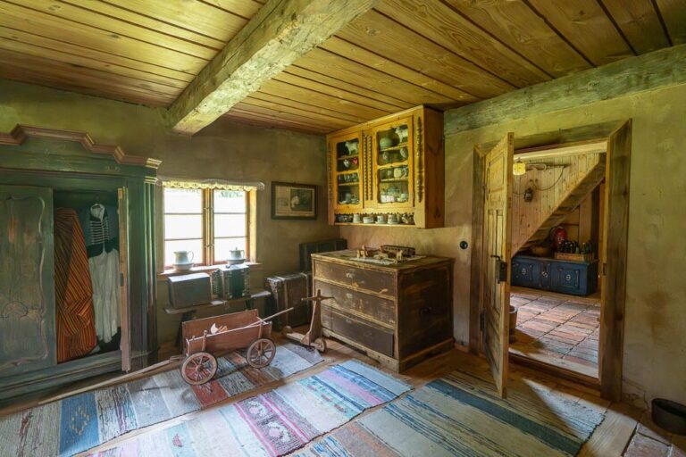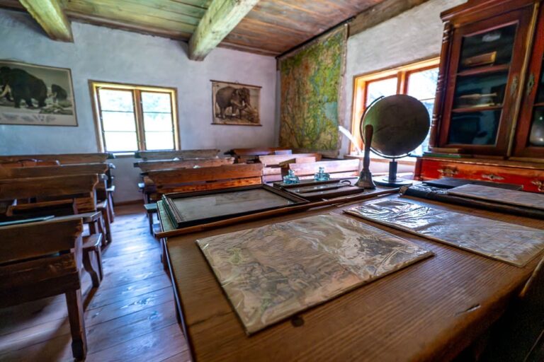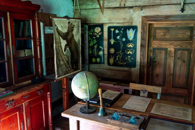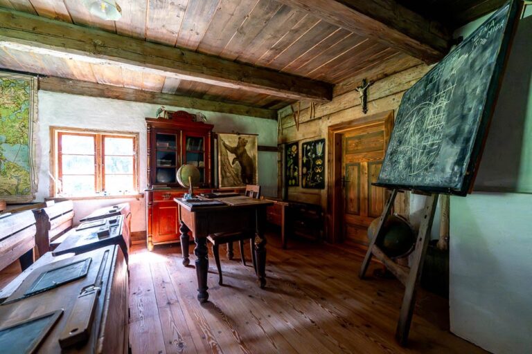 The cottage houses a museum: the rooms on the ground floor have been adapted to resemble a residential interior and a one-room village school, complete with the teacher’s living quarters.