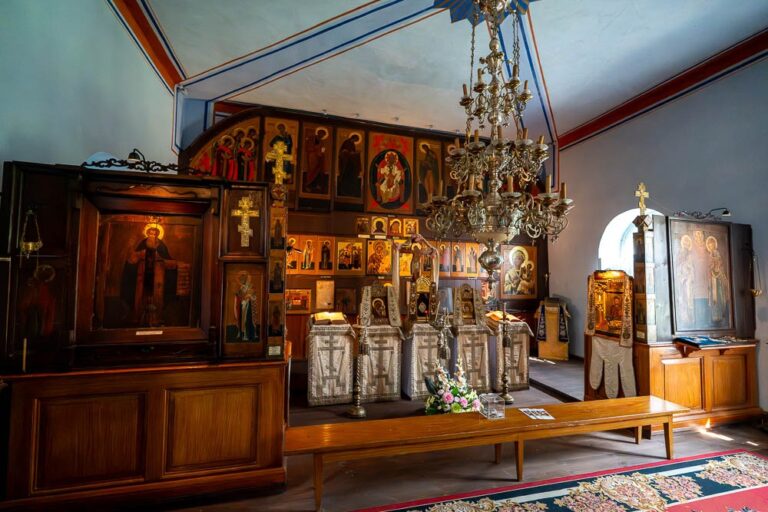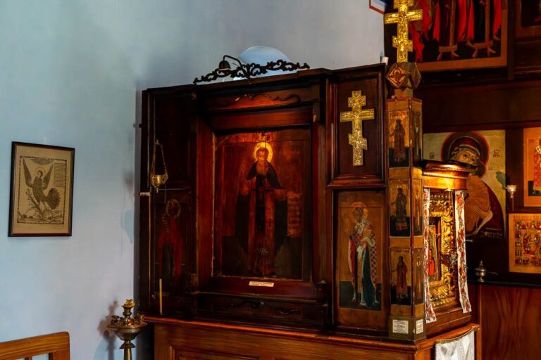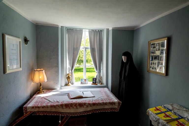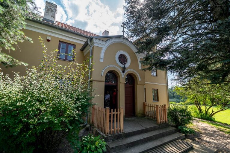 In 1885, a female community of Old Believers was established in buildings overlooking Lake Duś. Initially, the community would consist of not more than 40 nuns, who devoted their lives to prayer and farmwork, as well as caring for the elderly and those in need. The molenna (prayer house) features beautiful icons depicting the Holy Trinity, the Mother of God, Christ, and the prophets. A prominent feature is the 3.5-meter-high chandelier adorned with 32 candles, donated in 1910 by a Russian merchant as a memorial to his late wife, with the 32 candles symbolizing her age at the time of her death.
