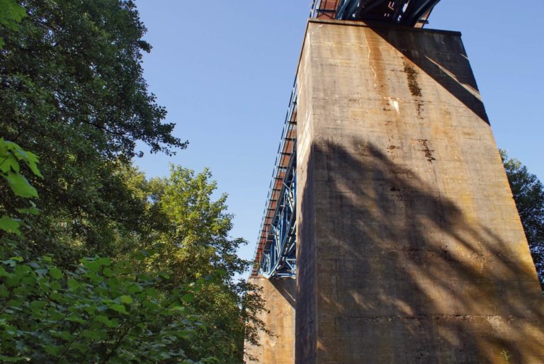 The three arc-shaped bays directed downwards are supported by two 28-meter pillars and two abutments. The bridge is 157 meters long. It was commissioned in 1884 together with a single-track railway, a second track was commissioned one year later.