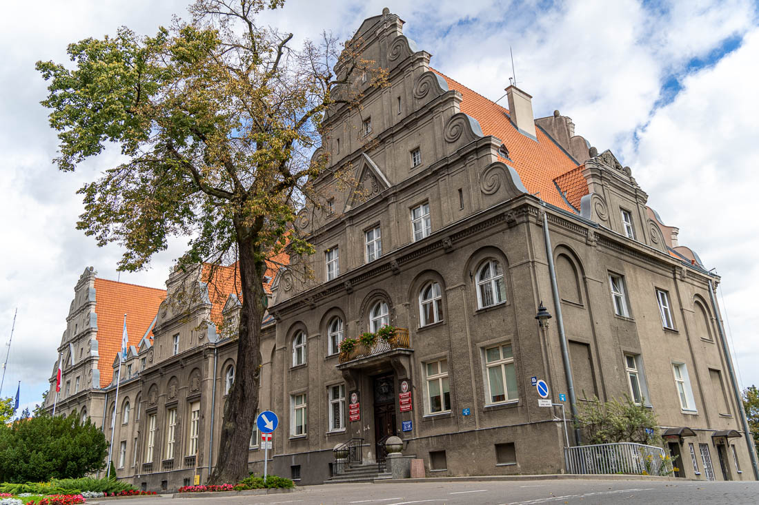 Budynek obecnego ratusza powstał w latach 1824-25 w miejscu wcześniejszego ratusza z XV wieku, który spłonął pod koniec XVII wieku. Jest budowlą wzniesioną w stylu klasycyzującym na planie prostokąta, dwukondygnacyjną, podpiwniczoną z użytkowym poddaszem, pokrytym naczółkowym dachem. Pośrodku kalenicy dachowej mieści się późniejsza, pochodząca z 1908 roku, neobarokowa wieżyczka. Czworoboczna sygnaturka z czterema tarczami zegarowymi, zwieńczona jest hełmem, z osadzoną na szczycie iglicą z metalową chorągiewką.